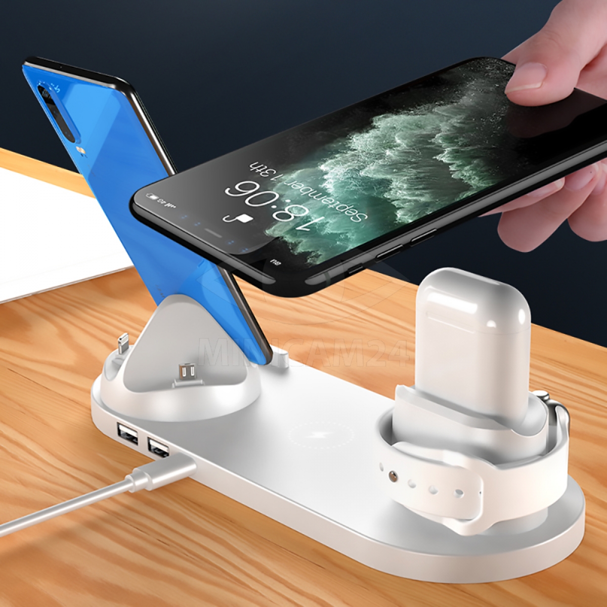 Беспроводная зарядка WS5 6в1 для смартфона позволяет подзарядить устройство без использования проводов. При помощи зарядной станции можно пополнить заряд телефонов, умных часов, фитнес браслетов, беспроводных наушников - достаточно разместить гаджет на площадке. Одновременно может заряжать до шести различных приборов. Во встраиваемом зарядном устройстве реализована защита от перезарядки и перегрузки. Также интеллектуальная система не будет срабатывать, если на площадке размещено инородное тело. Встроенные зарядные катушки обеспечивают высокую скорость заряда.